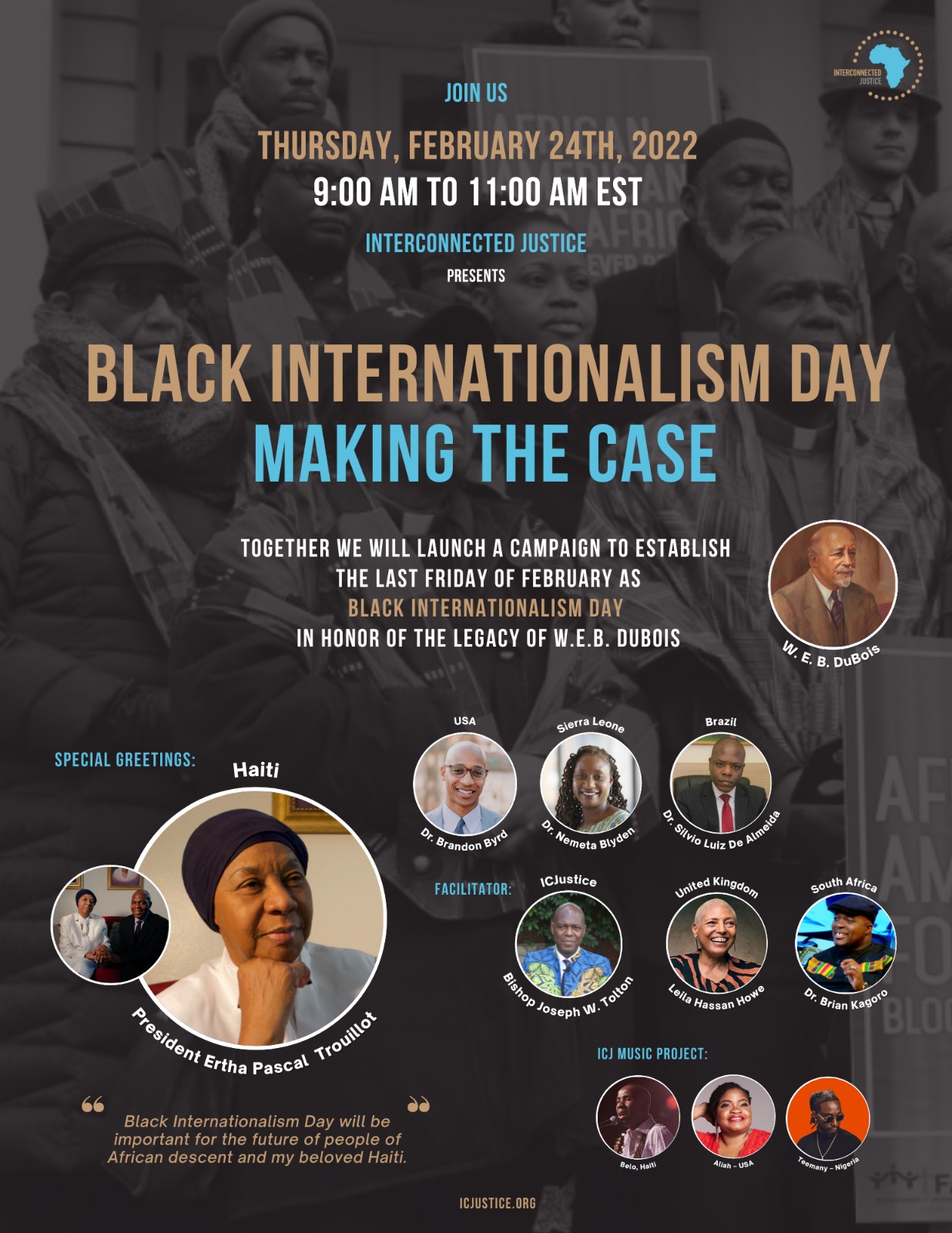 NEW YORK, NEW YORK, UNITED STATES OF AMERICA, February 17, 2022 /EINPresswire.com/ -- President Ertha Pascal Trouillot of Haiti joins forces with Bishop Joseph W. Tolton, President of Interconnected Justice, in calling for the establishment of BLACK INTERNATIONALISM DAY. President Pascal will break her silence and address the issue of gang violence in Haiti. She will state clearly why She believes that people of African descent globally must unite in solidarity with each other on many issues including standing united in support of Haiti. — President Ertha Pascal Trouillot